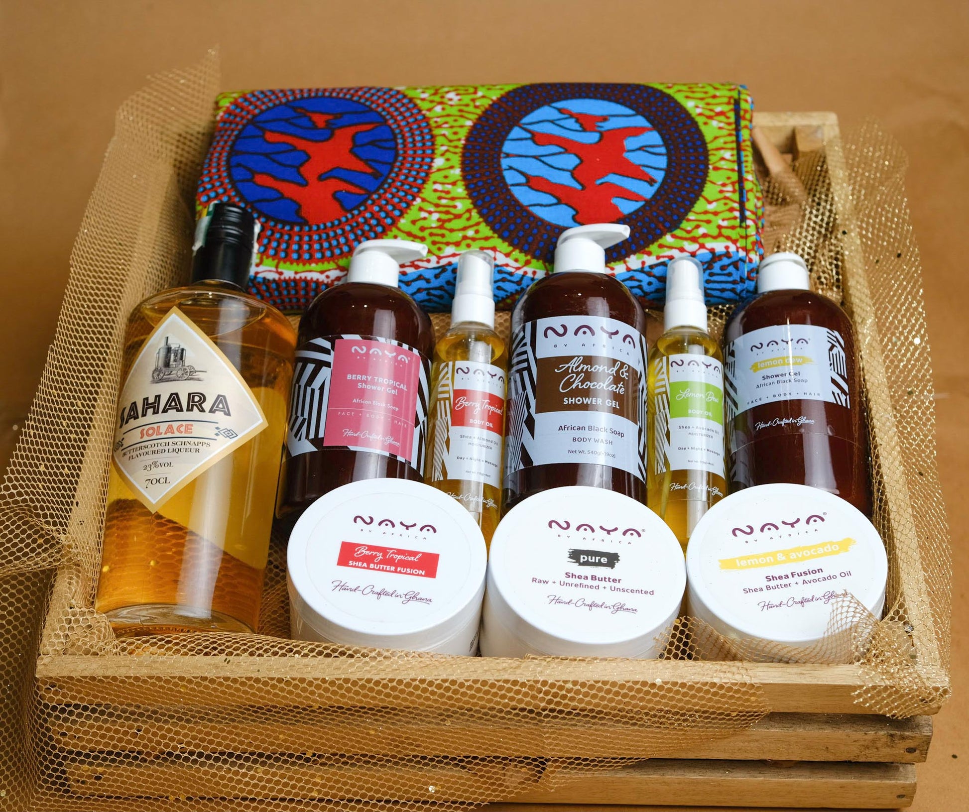 It contains 3 - 19oz Shower Gel, 3 - 9oz Shea Fusion, 2 - Body Oils, 6 yards of GTP Fabric and Sahara Butterscotch Liquor